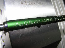 Our diamond engraving bit holder enables you to even engrave on curved surfaces. This is done with a spring-loaded positioned diamond construction. Our photos show the engraving of a curved corkscrew made of black eloxadizing aluminium.