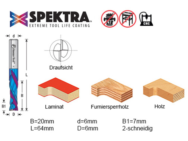 The blue nano-coating of the compression bit is an ultra-thin nACo® ceramic coat in the µ-range. That guarantees the high sharpness of the cutting edge for a long time and thus ensures a long service life and cutting results of the highest quality.