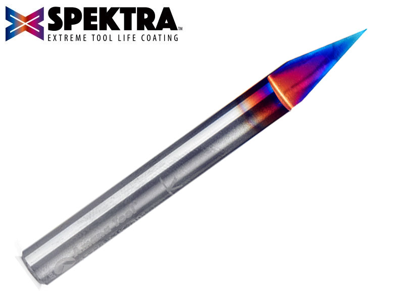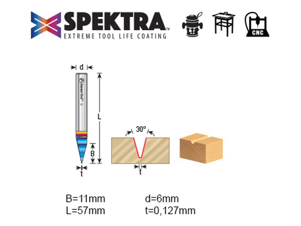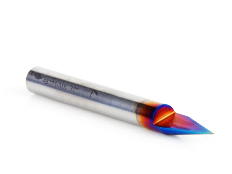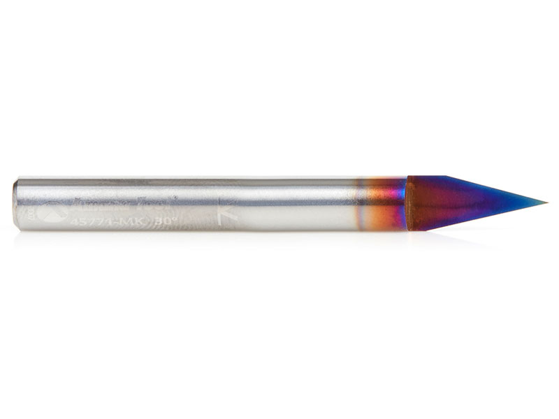 The Amana Tool® CNC singmaking engraving bit from the Spektra series achieves extra-fine marking and carving details with a 0.127 mm narrow tip and a 30° angle. These tools you can use for aluminium, wood, plastic and solid surface materials. Depending on the power of the CNC machine, a maximum speed of 28,000 rpm is recommended.