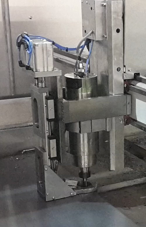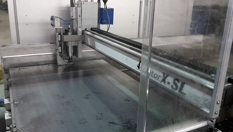 A customer who has specialized in the laying of steel plates in large factory shops manufactures large metal panels for hall floors, with the milling machine RaptorX SL using a drill spindle and a pneumatic downholder.