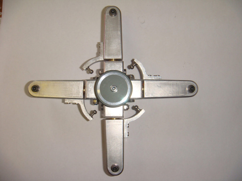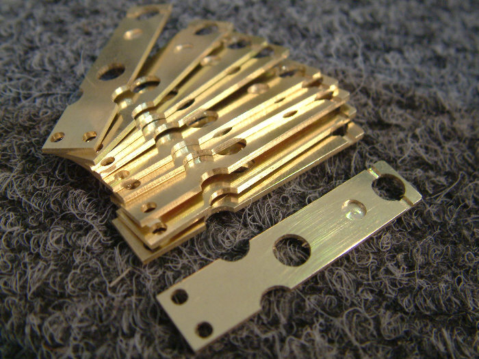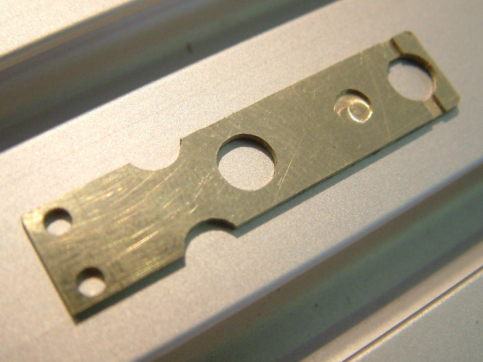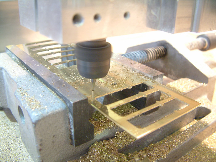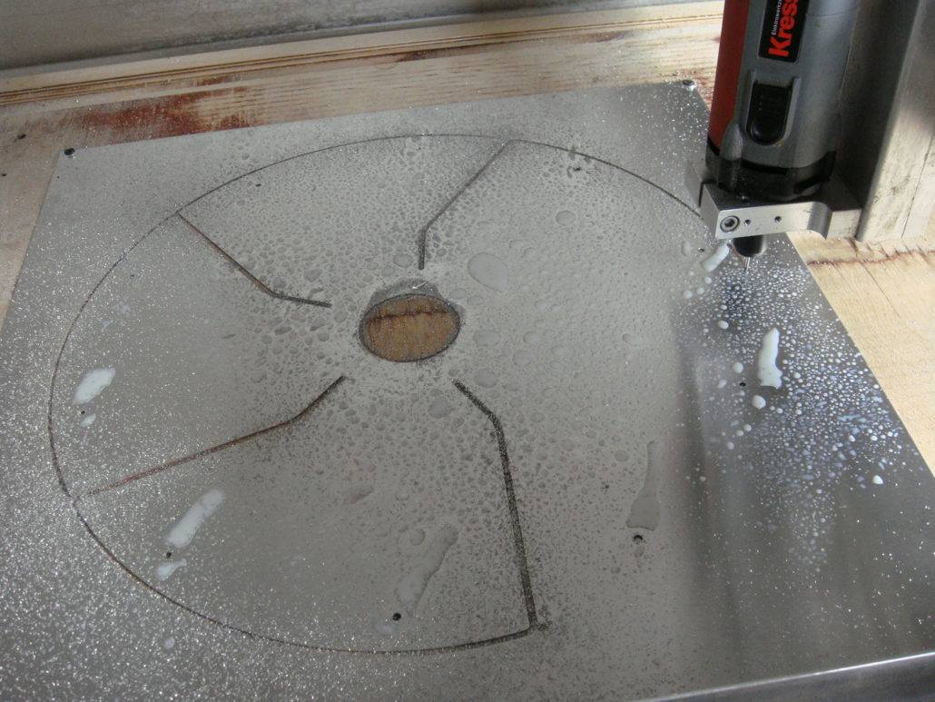 This 1 mm thick brass plate was treated with a 1,2mm spiral- toothed router. The feed motion came to 3mm/ sec with a spindle turn of approx. 1000 turns per min.