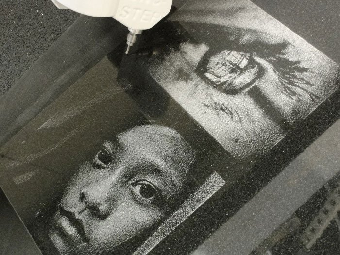 All grayscale in the photo is taken into account and regulated the pressure of the grinding tool via a special electronic system and the software so that lighter and darker areas are generated in the material to be processed, which ultimately represent a photo.