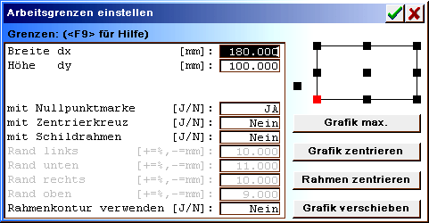 | Frame: | Work limits bottom left(0) to top right(1). The input of the work limits refers to the zero point selection (right, next to the input). With the zero point selection (9 points in the frame), only the values for width dx and height dy are input. With selection of zero point outside the frame, all values for bottom left to top right are expected. |