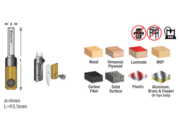 We deliver the Amana Tool® tool body without insert knives, but we have seven different cutting and engraving knives ready for you in our assortment. Depending on the choice of insert, you can engrave or mill profiles.